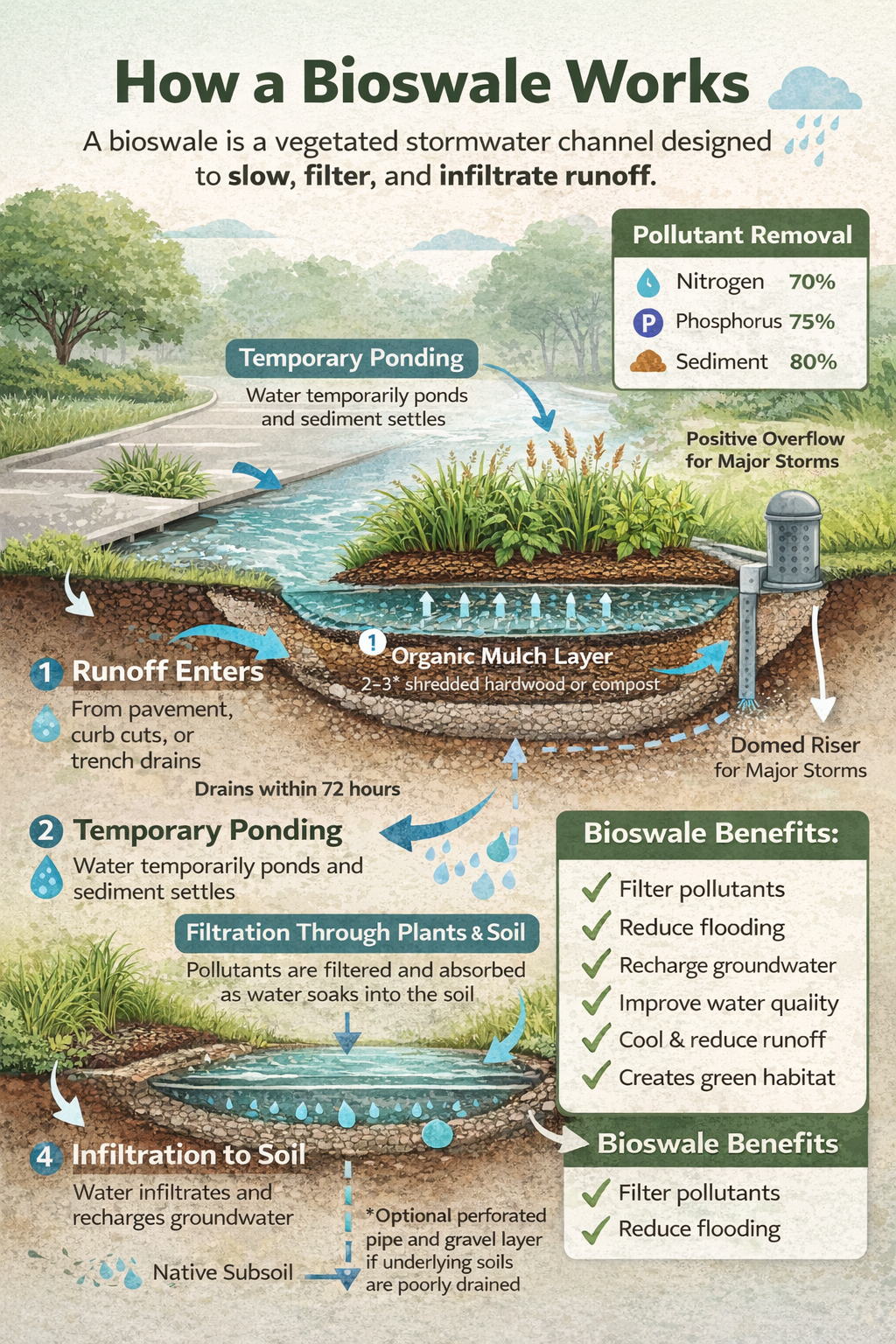 Bioswales collect stormwater runoff and move it away from impervious surfaces like roads, parking lots, or rooftops, while simultaneously slowing down the water flow and allowing it to infiltrate the ground and be filtered by plants and specialized soils.